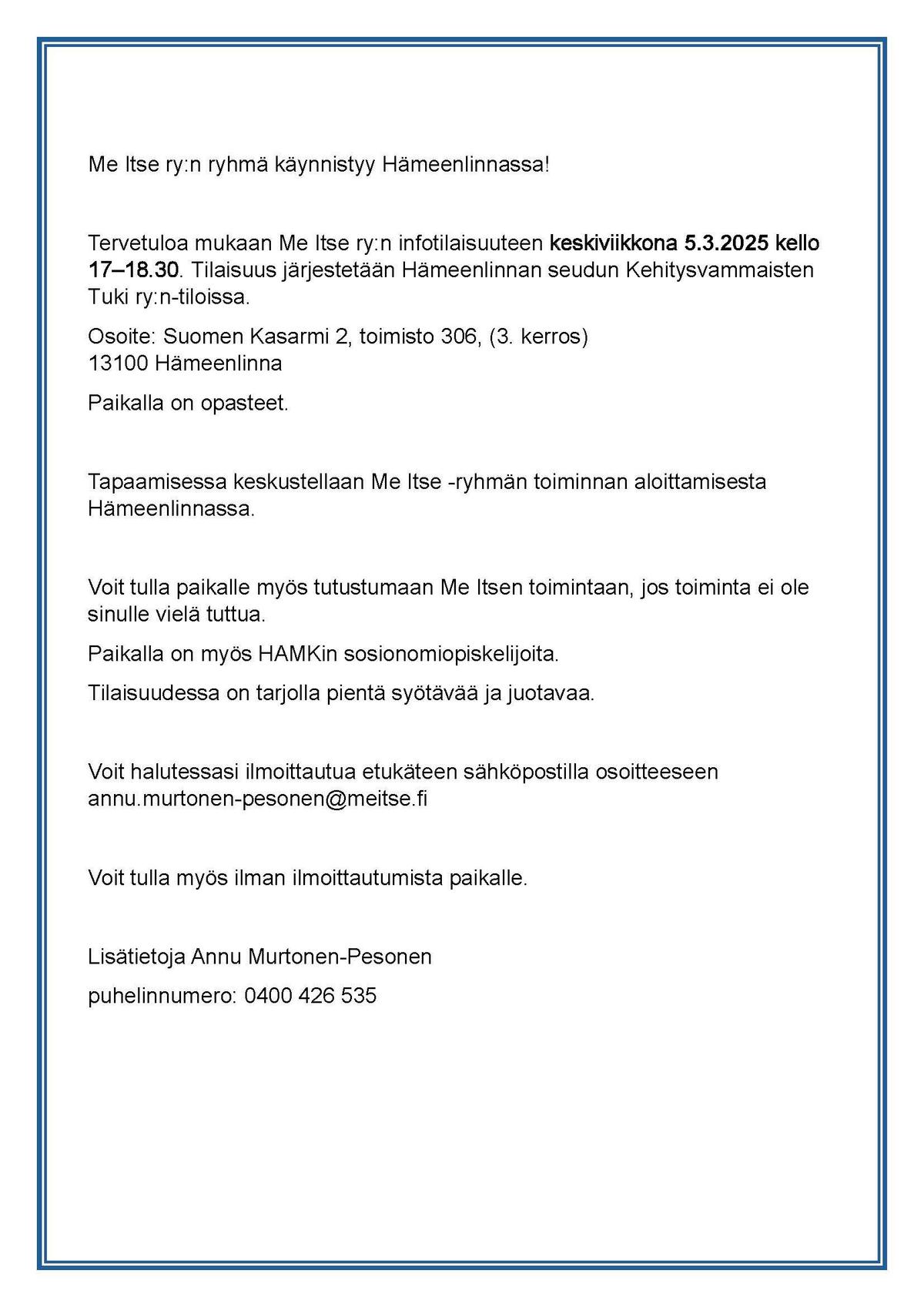 Me Itse ryhmä käynnistyy jälleen Hämeenlinnassa!